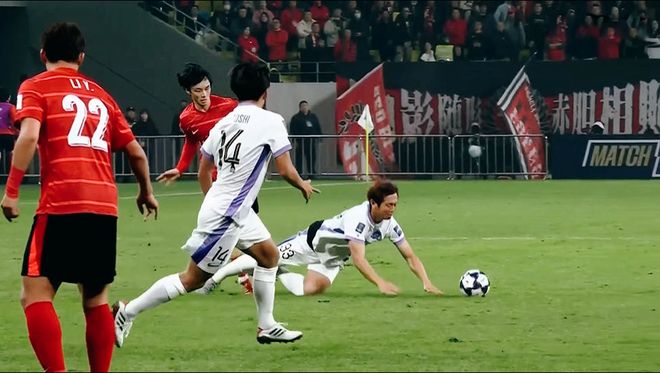 下半场回来,仅仅一分钟,对手利用边线球的机会,禁区连续形成颇具威胁的射门,幸亏蹇韬注意力高度集中,力保球门不失!第50分钟,禁区内周定洋被荒木隼人推倒,裁判果断吹罚点球,费利佩一蹴而就,1:0!